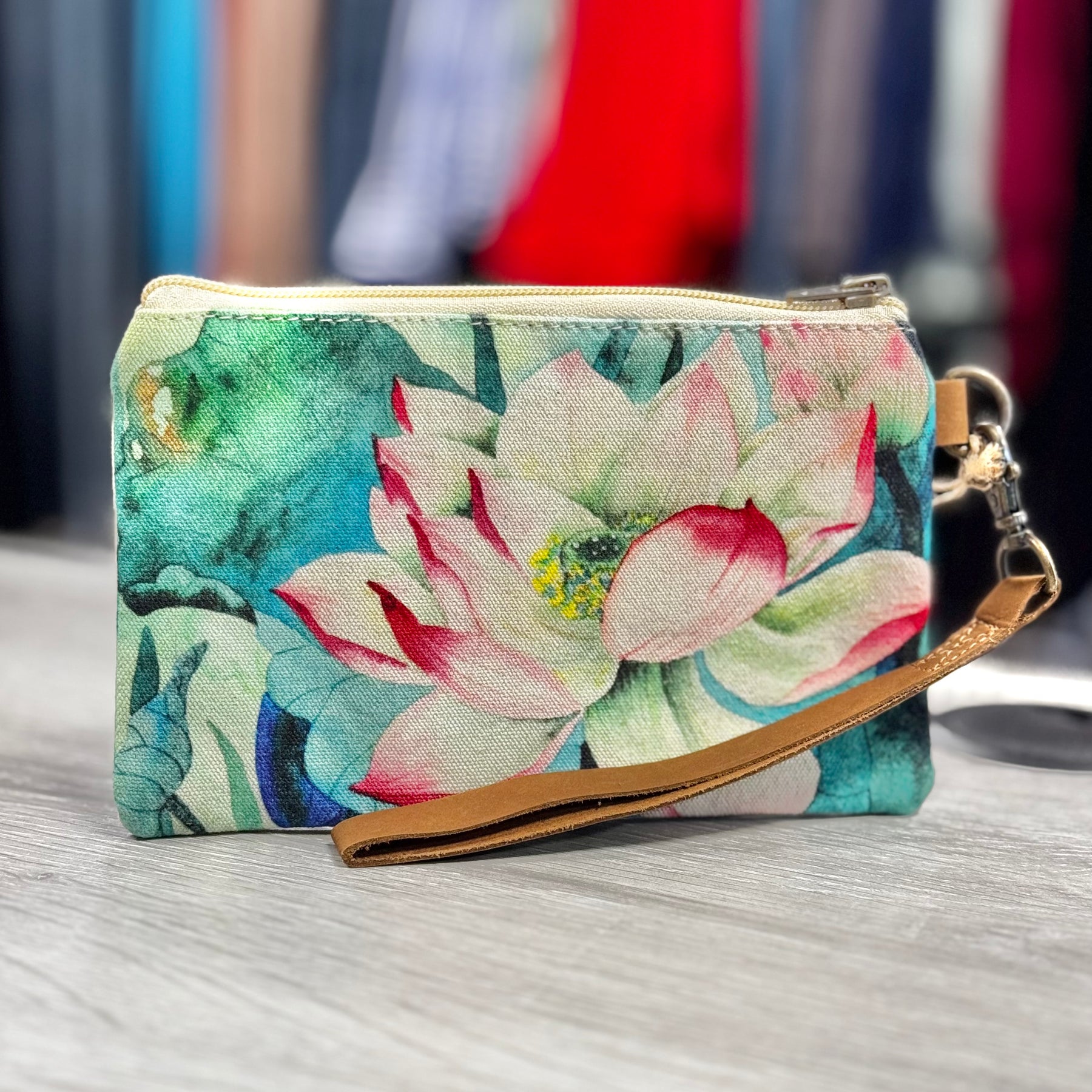 Fully lined wristlet pouch is made from 100% high quality cotton canvas with durable digital prints. Wrist strap is 100% genuine leather.