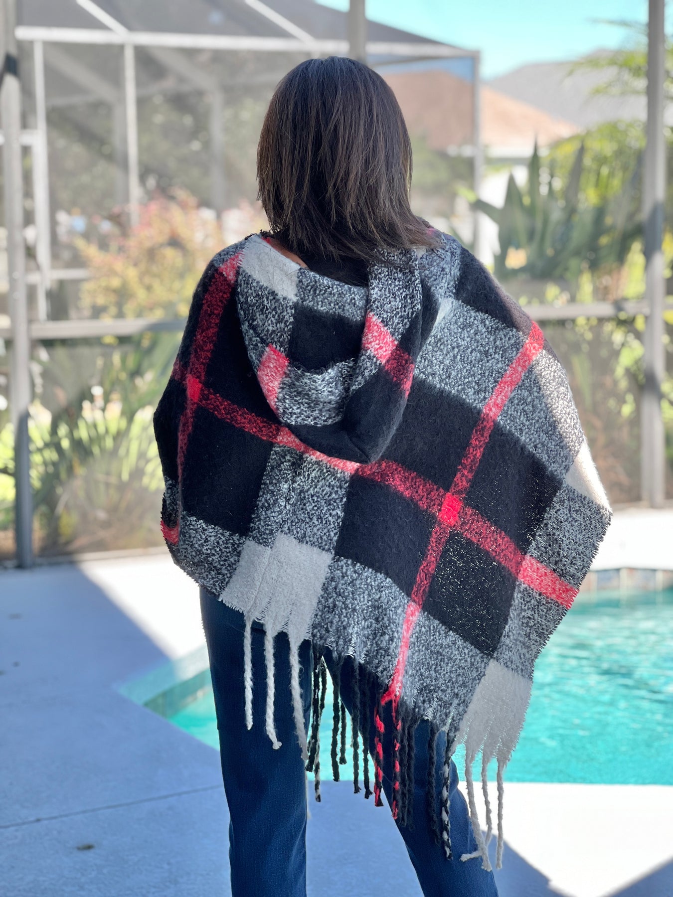 Combining this hooded plaid poncho with charcoal skinny jeans is a great choice for a casual, cool look. Materials: Polyester
