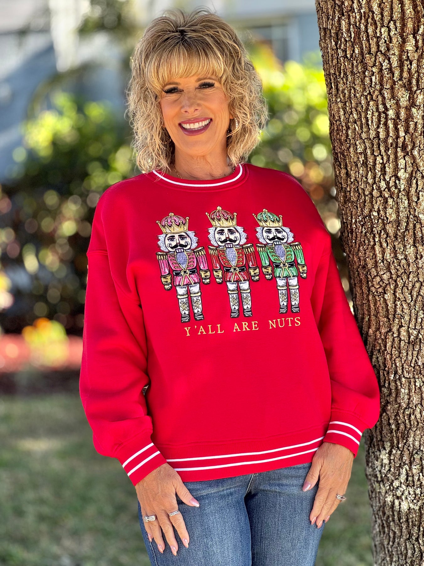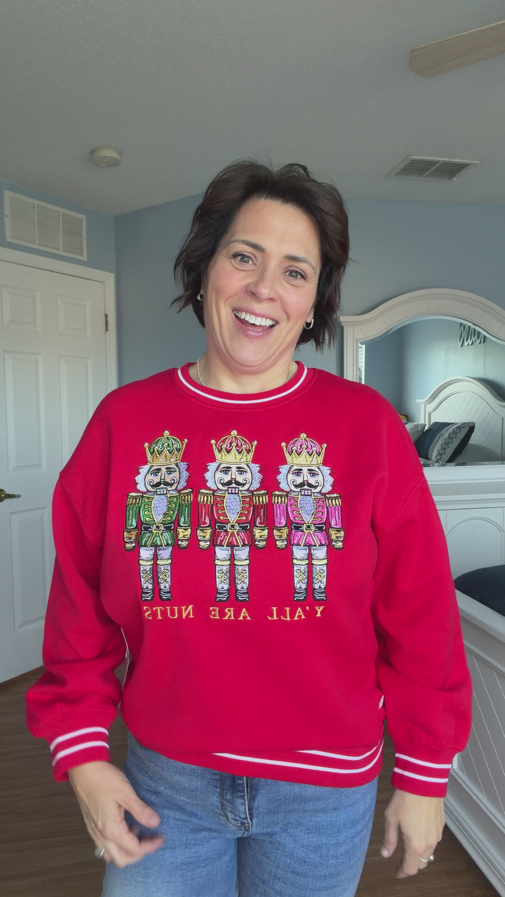 The star of the show is the embroidered nutcracker trio across the front—bright, detailed, and full of festive spirit. Underneath, the cheeky embroidered phrase “Ya’ll Are Nuts” adds a dose of humor that’s sure to bring a smile to your holiday gatherings. It’s the perfect mix of cozy and whimsical, making it an instant favorite for the season.