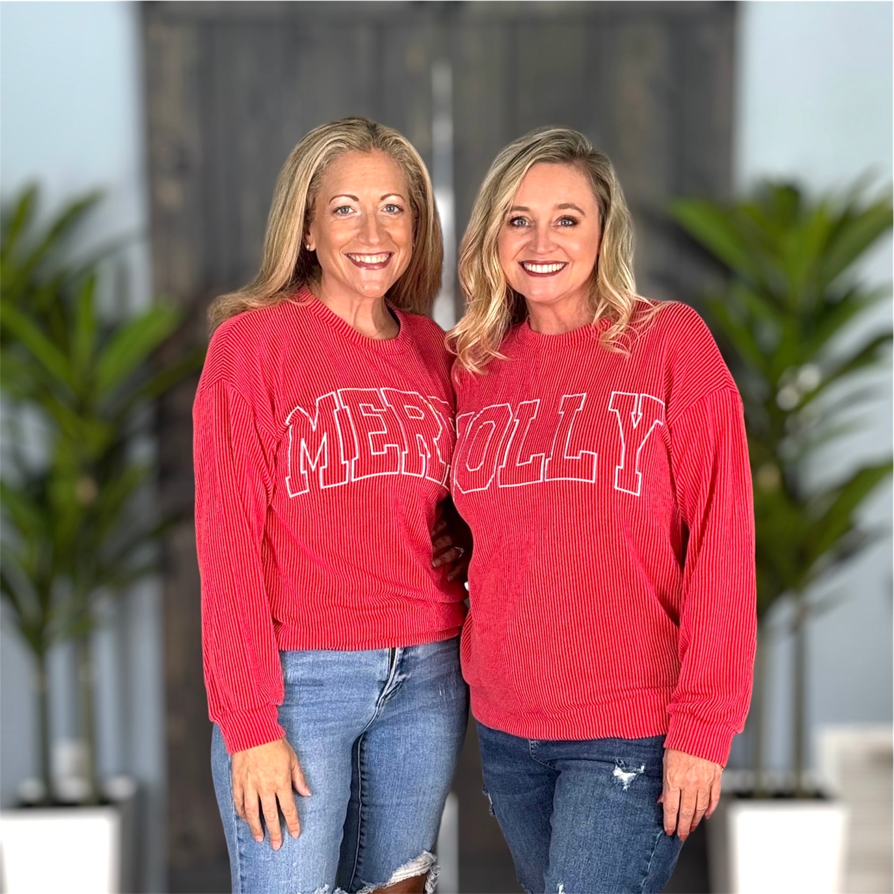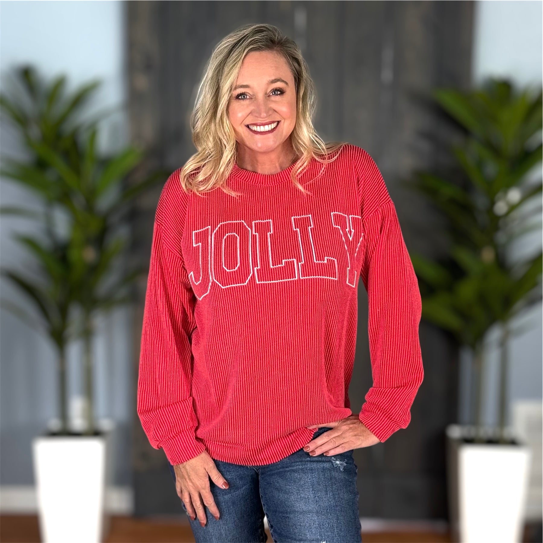 Get ready to sleigh this holiday season with our Radiantly Ribbed JOLLY Top! Made with long red sleeves and a cozy round neck, this top is perfect for any festive occasion. Spread some cheer and style with this must-have addition to your holiday wardrobe!