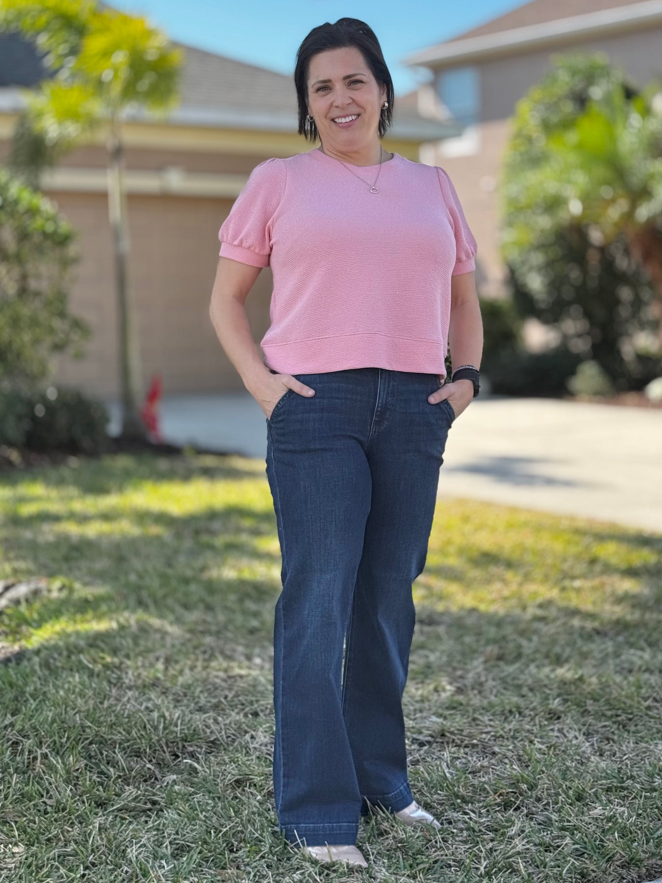 Introducing the must-have The Beka Trouser Jean! With a high waisted, wide leg design and dark wash, these jeans offer ultimate comfort and stretch for everyday wear. No distressing and a double button and belt loop accent make these the perfect addition to your wardrobe.
