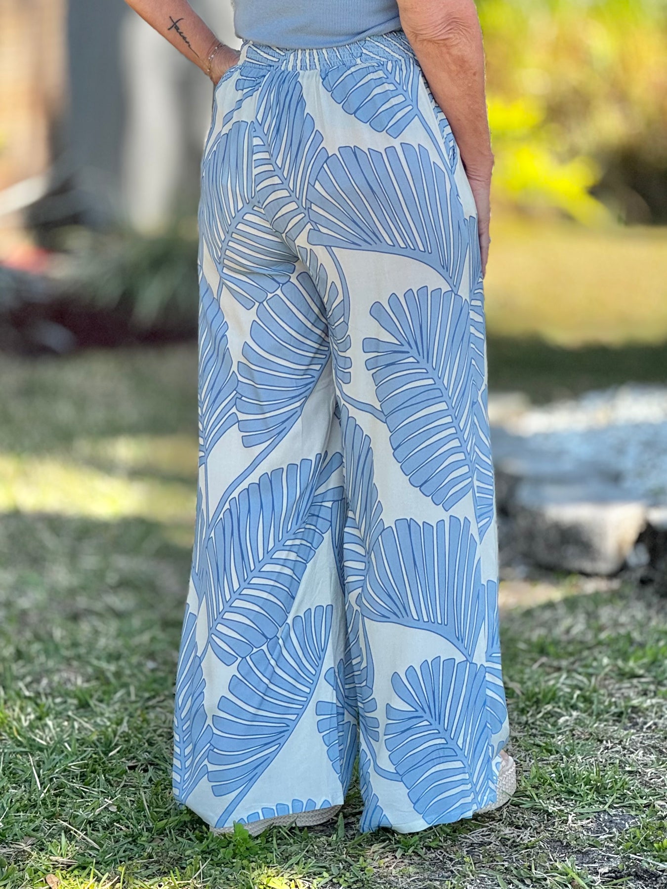 Bring effortless style and comfort to your warm-weather wardrobe with these statement-making pants. Designed with a flattering wide-leg silhouette, they feature functional front pockets and a self-tie belt that defines the waist while keeping the fit relaxed and comfortable. The palm frond print adds a breezy, tropical-inspired touch that feels fresh and fun for the season.