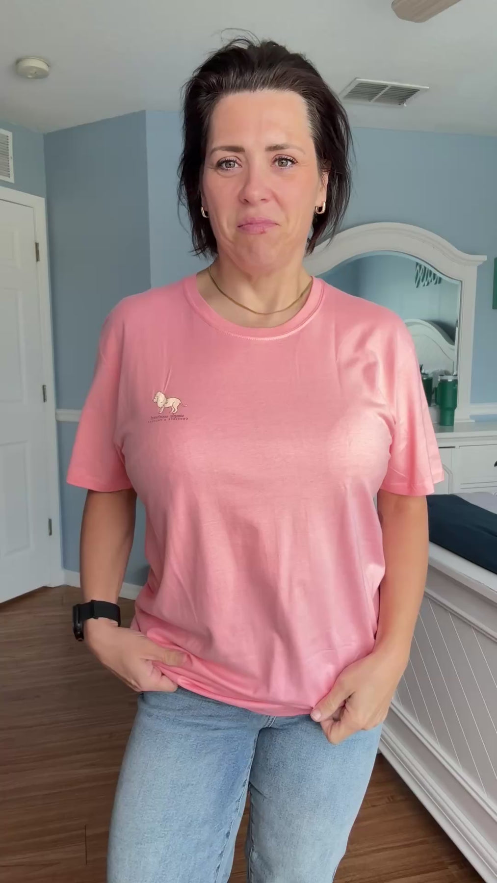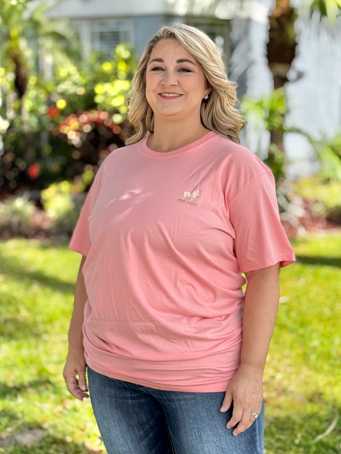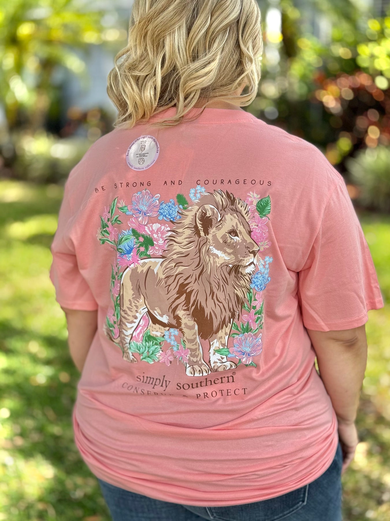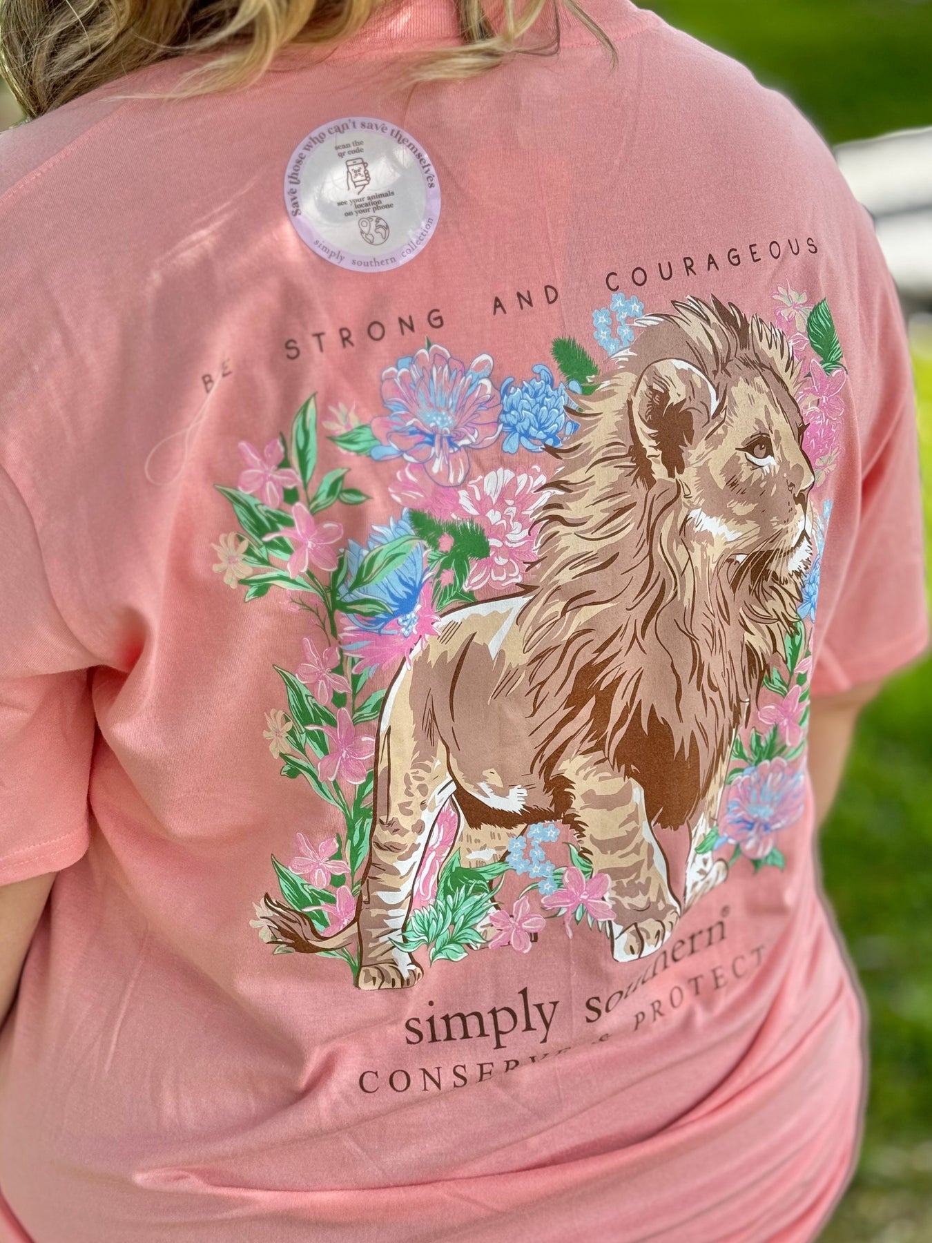 Support animal conservation efforts with the Lion Conserve And Protect Tracking Graphic Tee from Simply Southern. Made of peach material with a classic cut and unisex fit, featuring a lion among flowers with 'Be strong and courageous' on the back. Plus, each tee comes with a unique QR code to meet your sponsored lion and track their progress. Join the cause today!
