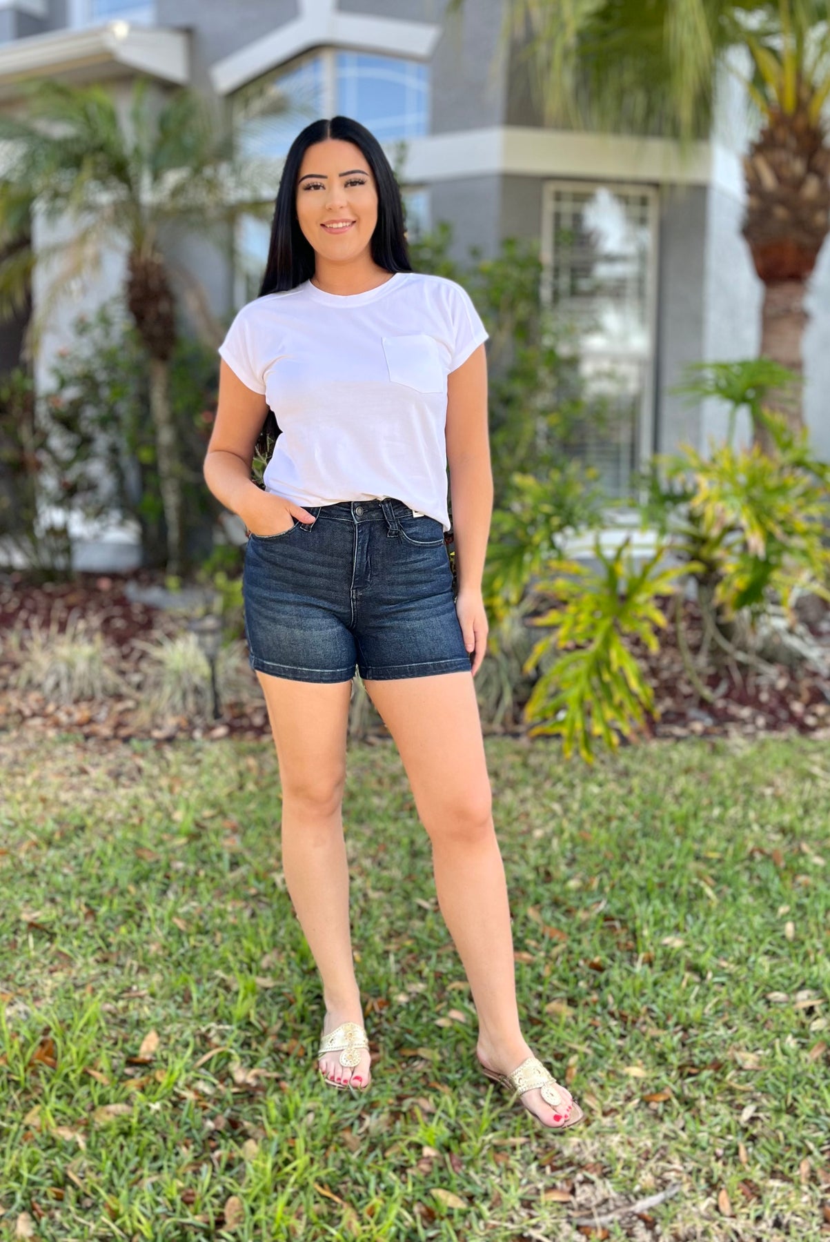Stay comfortable and stylish all summer long in these must-have Judy Blue high waisted shorts. Designed in a rich dark wash with a clean, polished look, these shorts feature no distressing for a timeless style that can easily be dressed up or kept casual. The flattering high rise silhouette hugs in all the right places while offering the signature Judy Blue comfort and stretch you know and love, making them perfect for all-day wear.