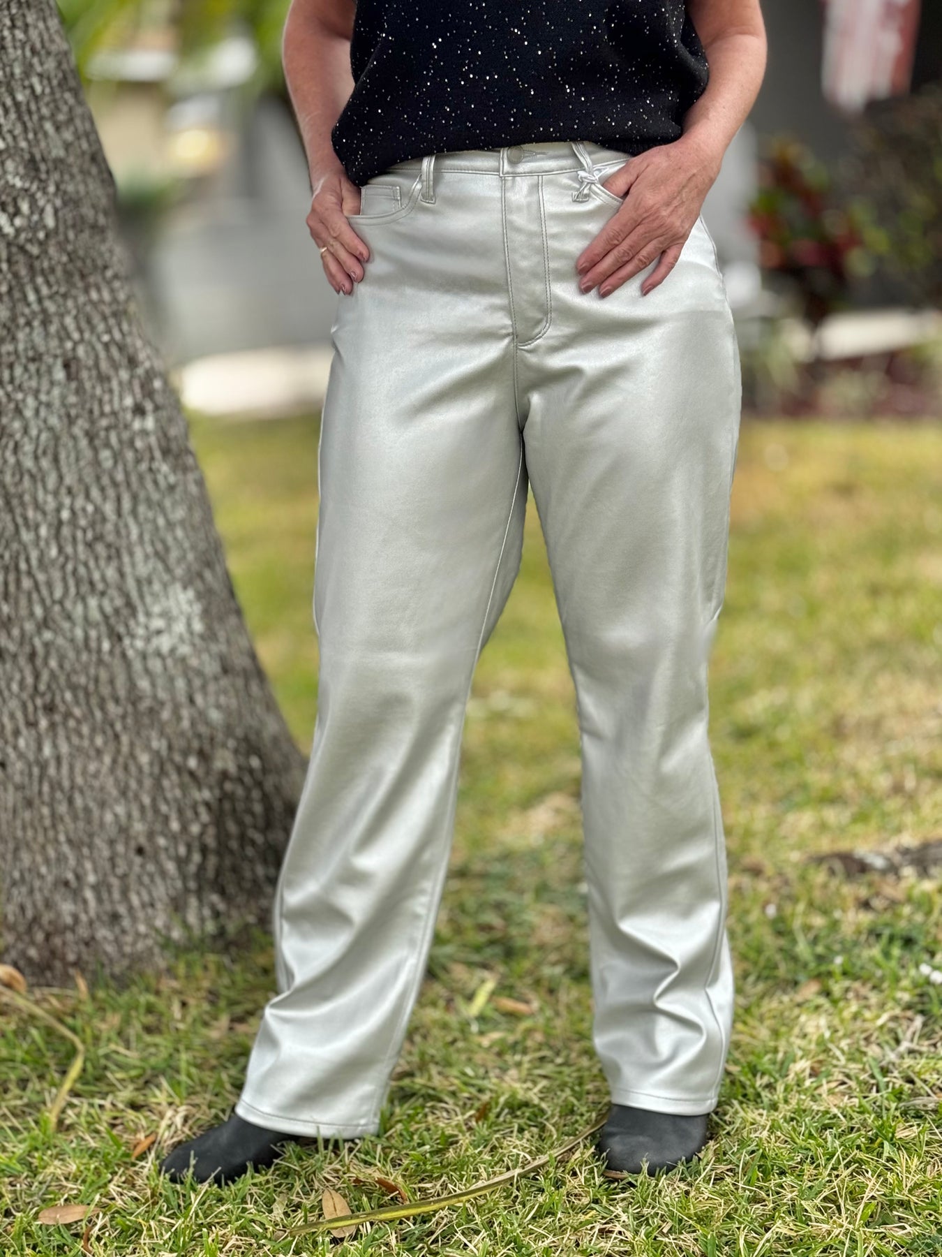 The silver faux leather finish brings the shine, making these pants your go-to for any fun, festive occasion or night out on the town. They’re eye-catching and one-of-a-kind, offering the perfect balance between statement-making and wearable. Whether you’re dressing them up with a sleek blouse and blazer or keeping it edgy with a cropped sweater and booties, these pants promise endless styling possibilities.