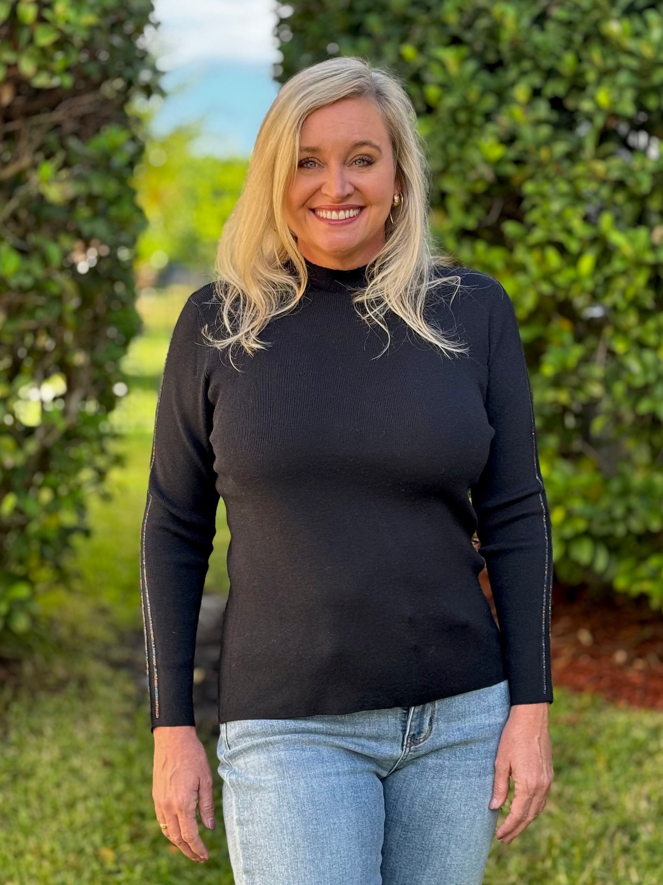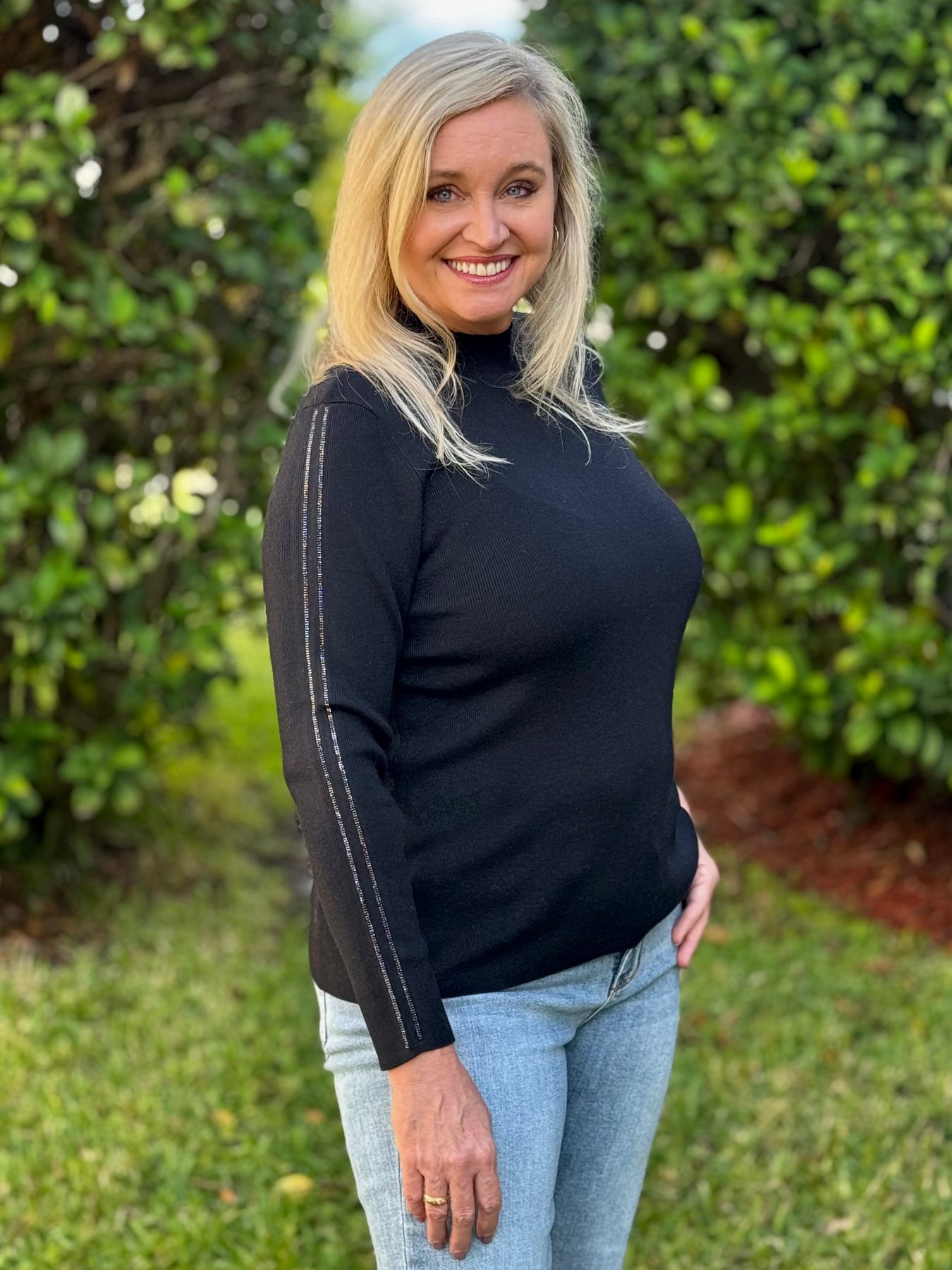 Perfect for layering or wearing solo, this versatile top pairs effortlessly with denim for a polished casual look or with a skirt and heels for an elegant evening out. Stylish, comfortable, and designed to shine just enough — this shimmer mock neck is a boutique favorite for any season.