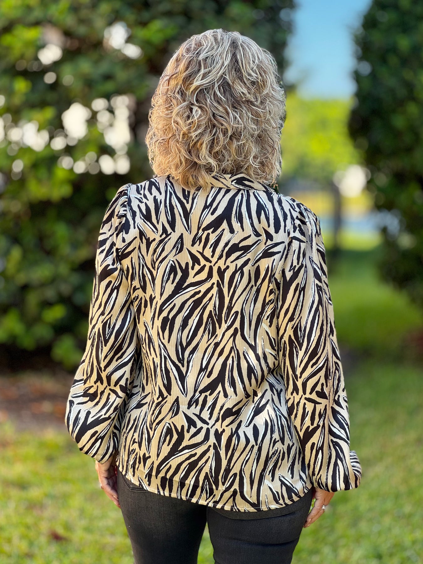 The crinkle-textured material gives the blouse a breezy, effortless vibe, perfect for year-round wear. The fun and distinctive print makes it stand out from the crowd — whether you choose to style it tucked into tailored trousers for a polished office look or pair it with your favorite denim for a chic, laid-back weekend feel.