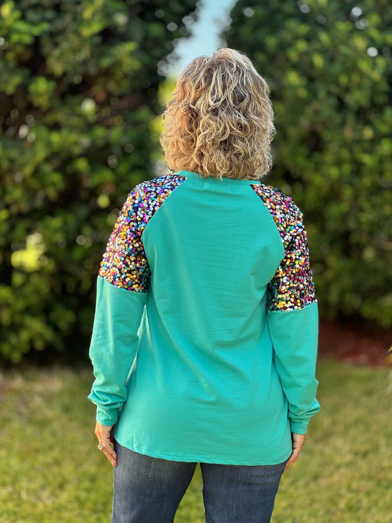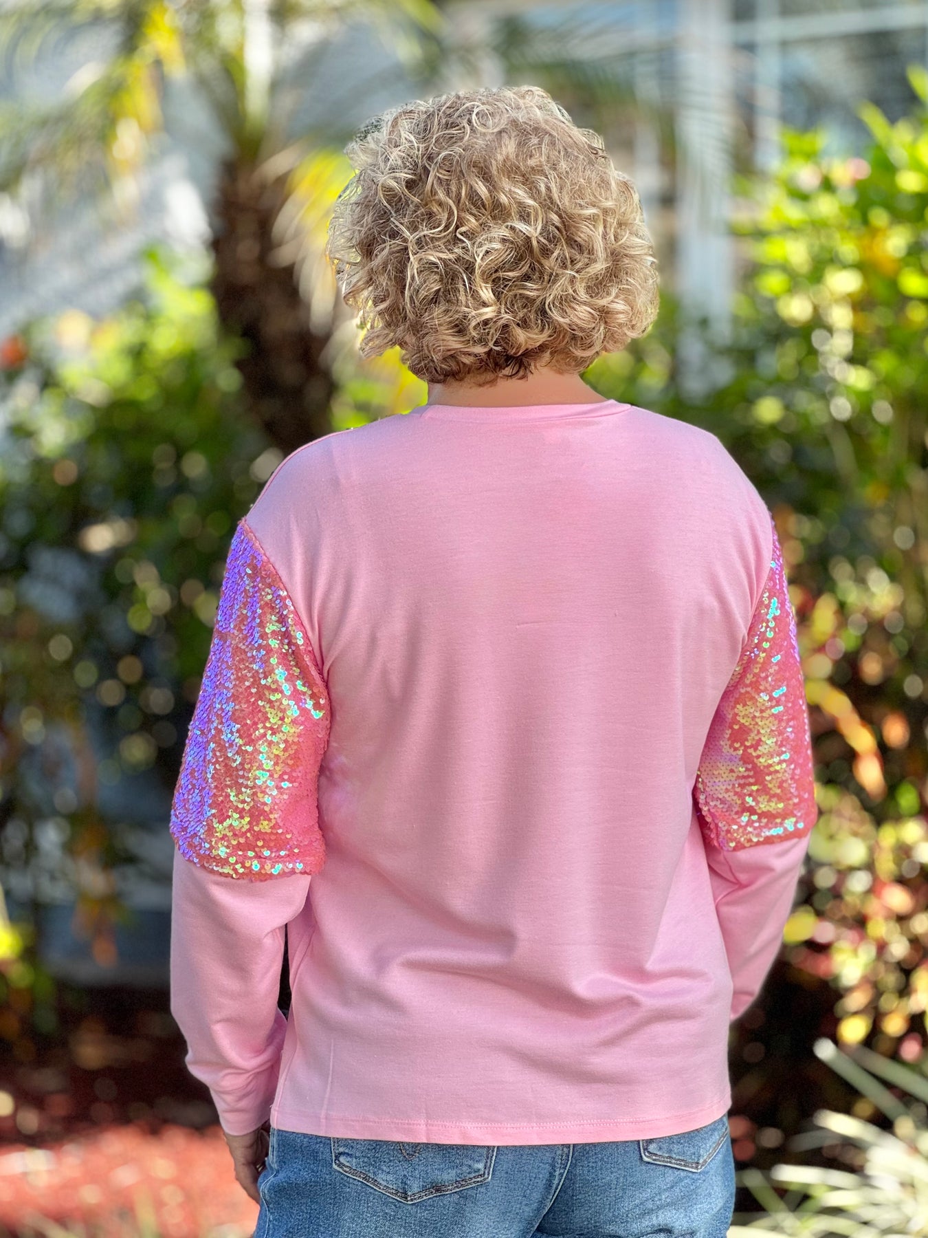 "Feelin' Festive": Add a sweet and sparkling touch to your holiday wardrobe with this Long Sleeve Pullover Sweatshirt — the perfect blend of cozy comfort and festive flair. Crafted from soft, breathable French terry material, it offers a relaxed fit that feels effortlessly comfortable while still keeping your look polished and fun. Designed with a classic crew neckline and lined sequin sleeves, it gives you that touch of shimmer and holiday magic without sacrificing comfort.