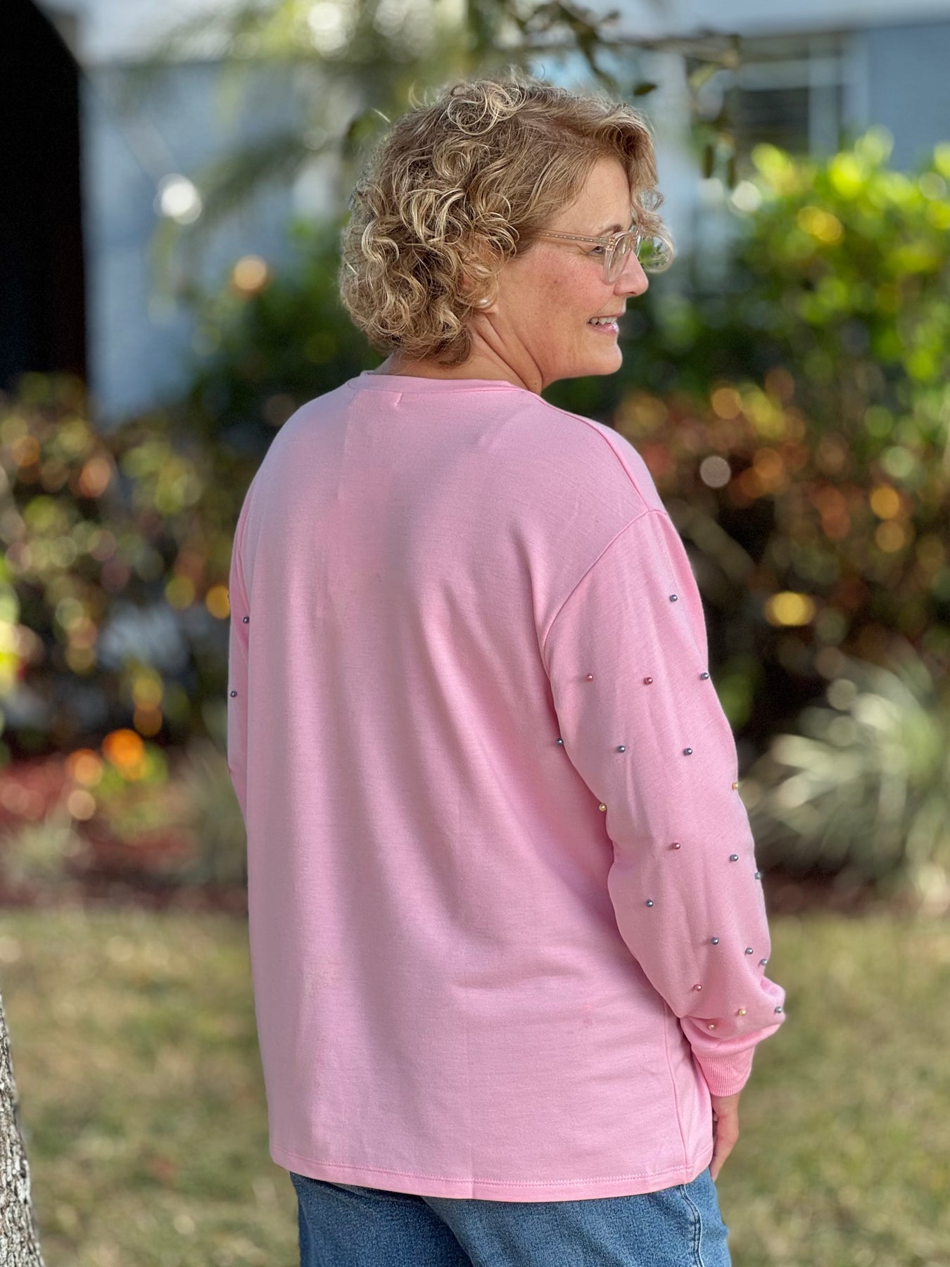 Plaid Tree Patch: Add a touch of holiday cheer to your everyday look with this festive long sleeve pullover. Designed with cozy comfort in mind, it features a classic crew neckline accented by red contrast trim along the sleeves and collar for a pop of seasonal charm. Cascading red pearl details down each sleeve bring playful elegance, while the flannel Christmas tree patch outlined in sparkling sequins makes the perfect festive statement on the front.