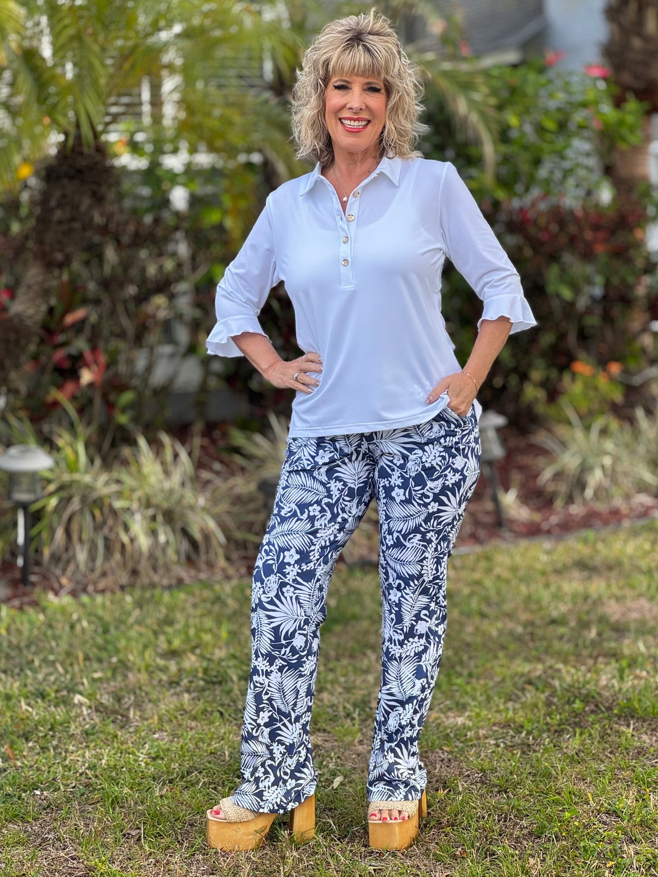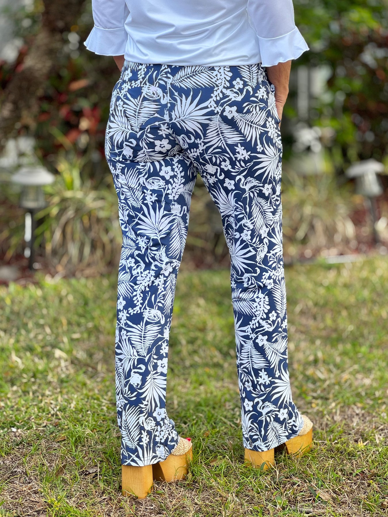 The standout charm comes from the fun navy and white tropical print, bursting with leafy florals and playful flamingos. It’s a lively, coastal-inspired pattern that pairs beautifully with simple solids or breezy summer tops, giving you endless styling options.