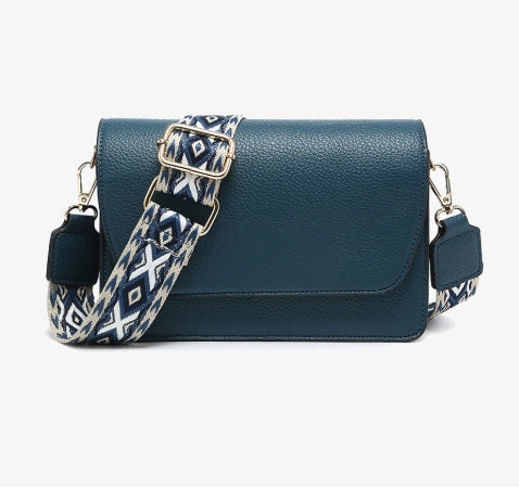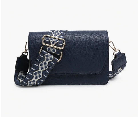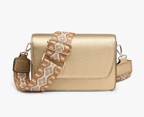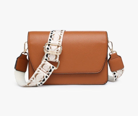This flapover crossbody features three compartments, including two zippered areas and card slots, and snaps closed for extra security.