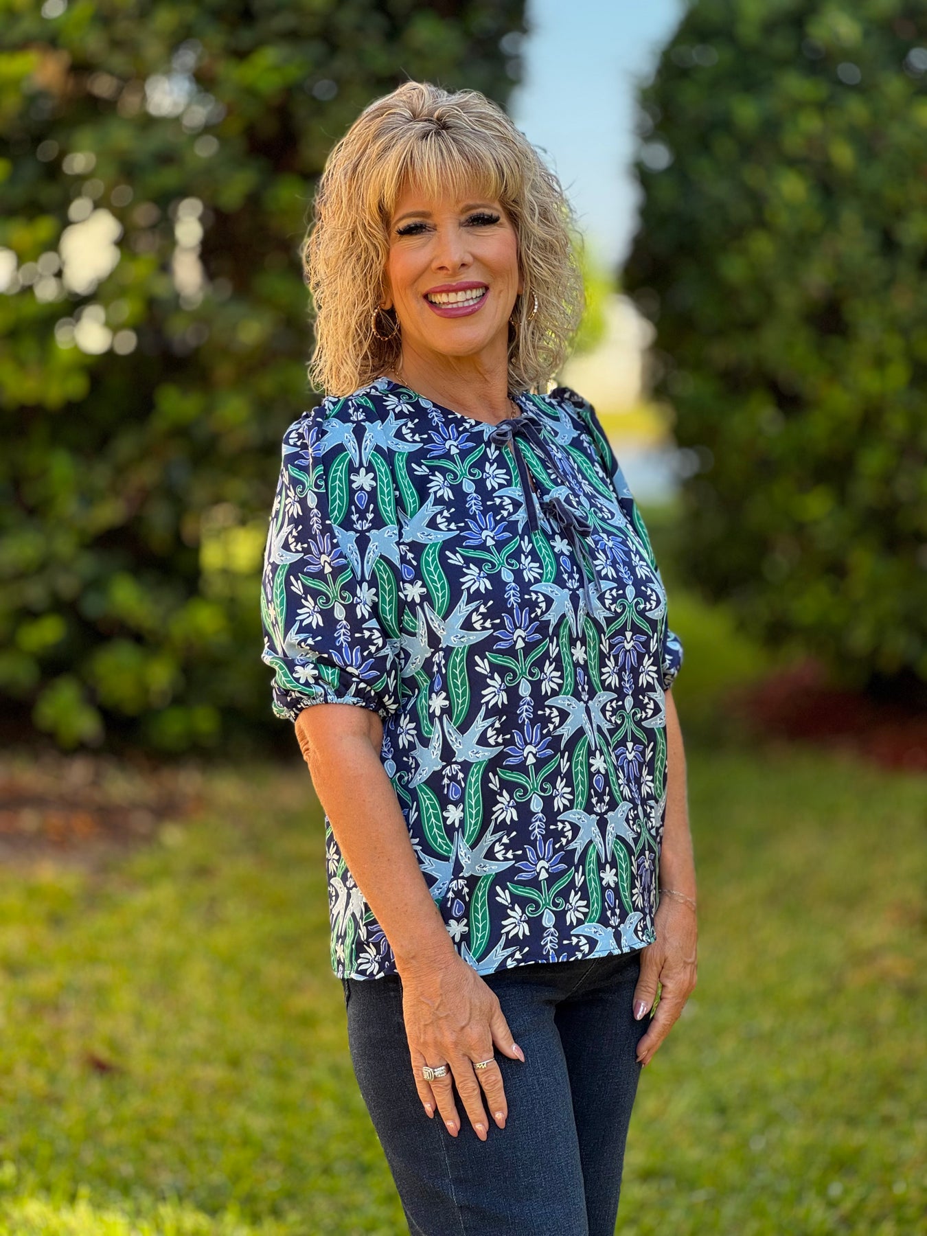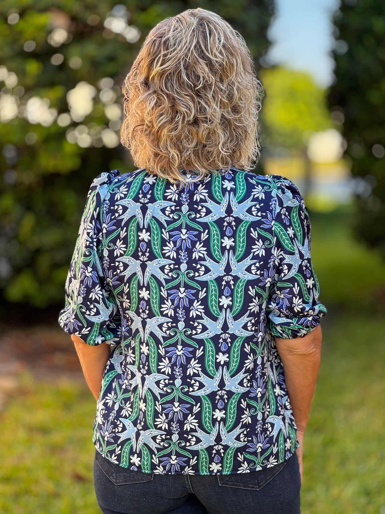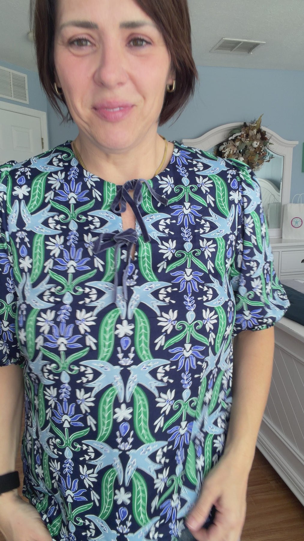 Elevate your everyday style with this gorgeous statement top, designed to capture both sophistication and a hint of whimsy. The 3/4 length puff sleeves with elastic cuffs add a soft, feminine volume, creating a beautifully balanced silhouette that flatters every shape. The V-neckline is perfectly accented with velvet tie details, adding a luxurious, romantic touch that sets this piece apart from the rest.