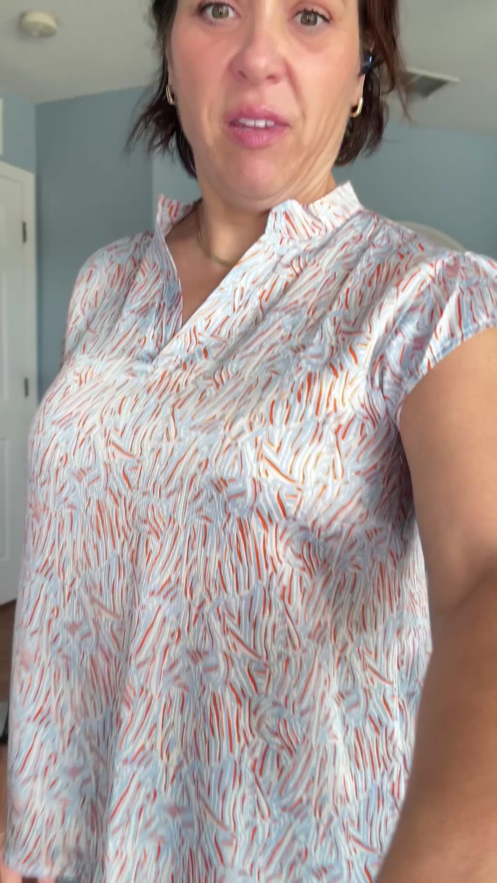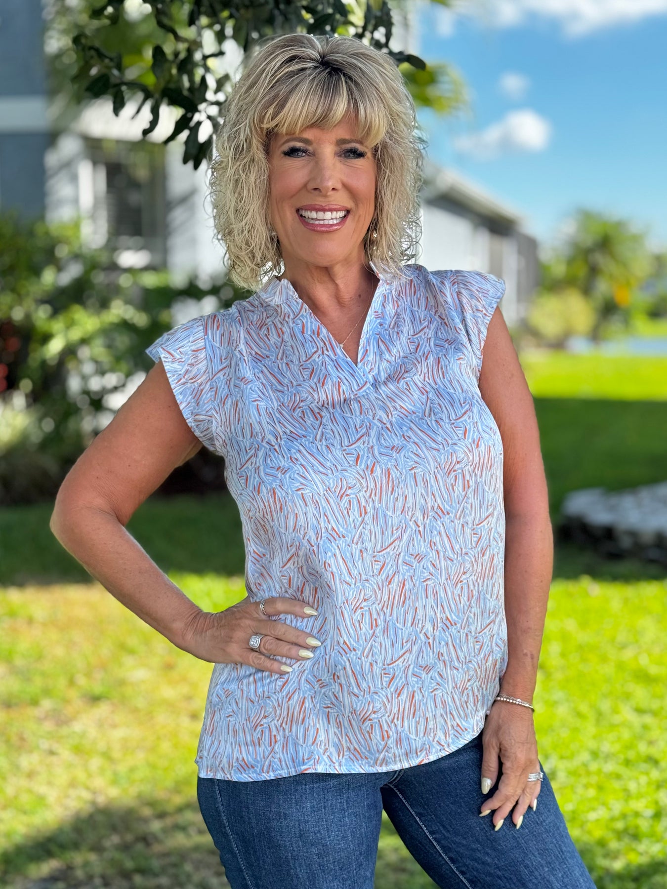 Introducing the Cynthia Top - the perfect blouse for any occasion! With its flattering v neck and slight ruffle sleeve, this top adds a touch of elegance to your outfit. The abstract pattern and lightweight fabric make it versatile for both casual or chic looks. Dress it up with white denim and wedges or keep it casual with denim shorts and a classic sneaker. Elevate your style game with the Cynthia Top!