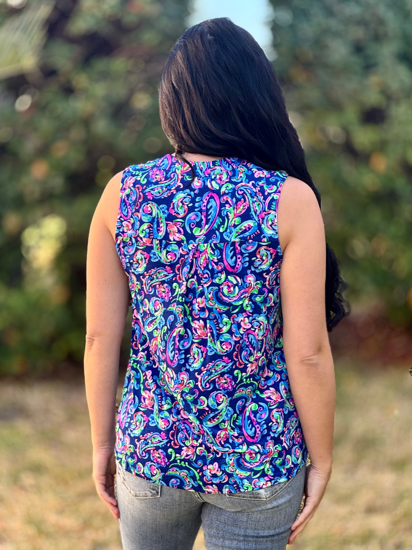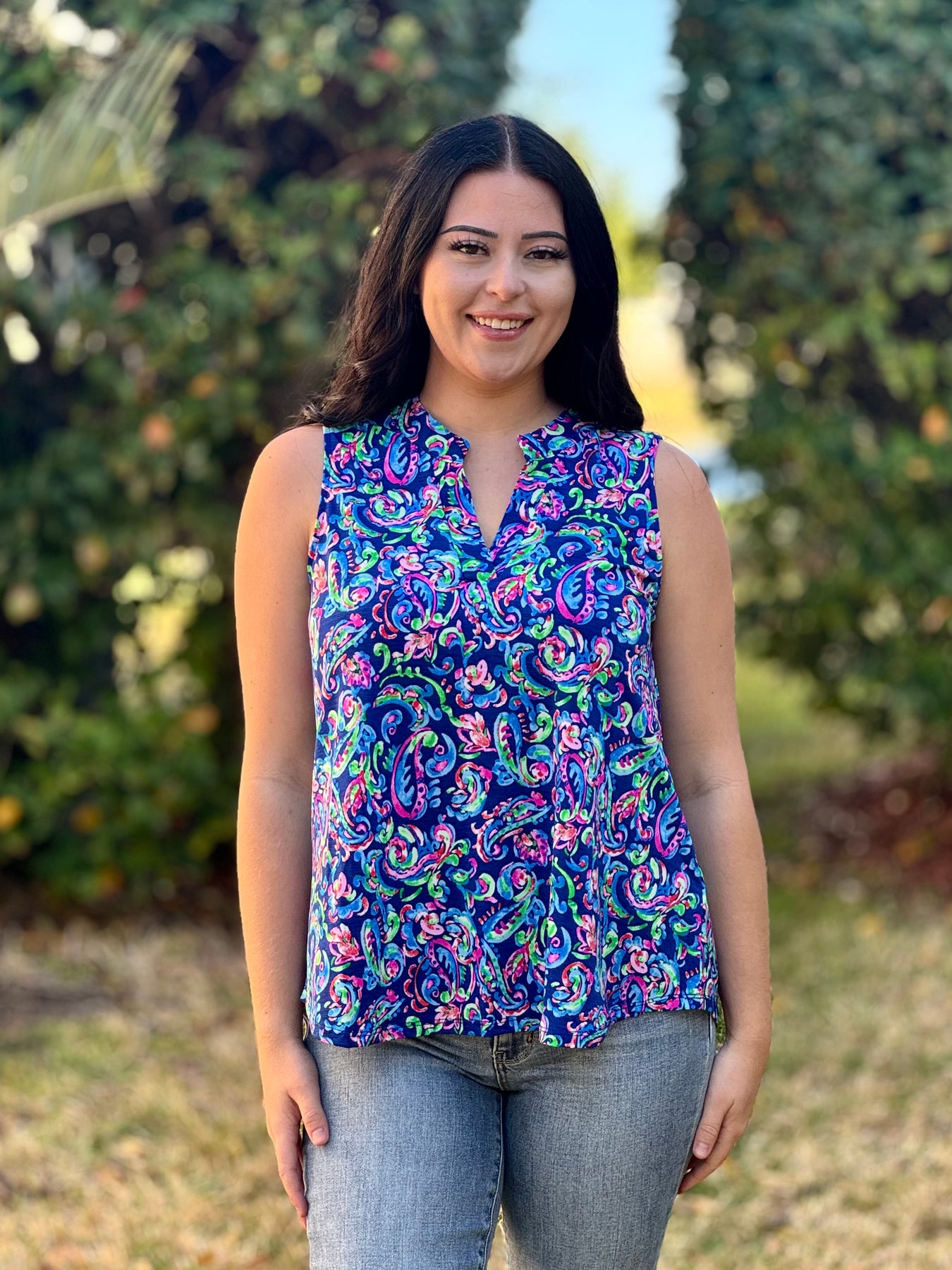 Bright, breezy, and beautifully versatile—this colorful tank is a warm-weather must-have for effortless style. Designed with a flattering A-line bodice, it drapes gracefully away from the body while creating a relaxed yet polished silhouette. The split neckline paired with a modern mandarin collar adds a refined detail that elevates this everyday essential beyond the basics.