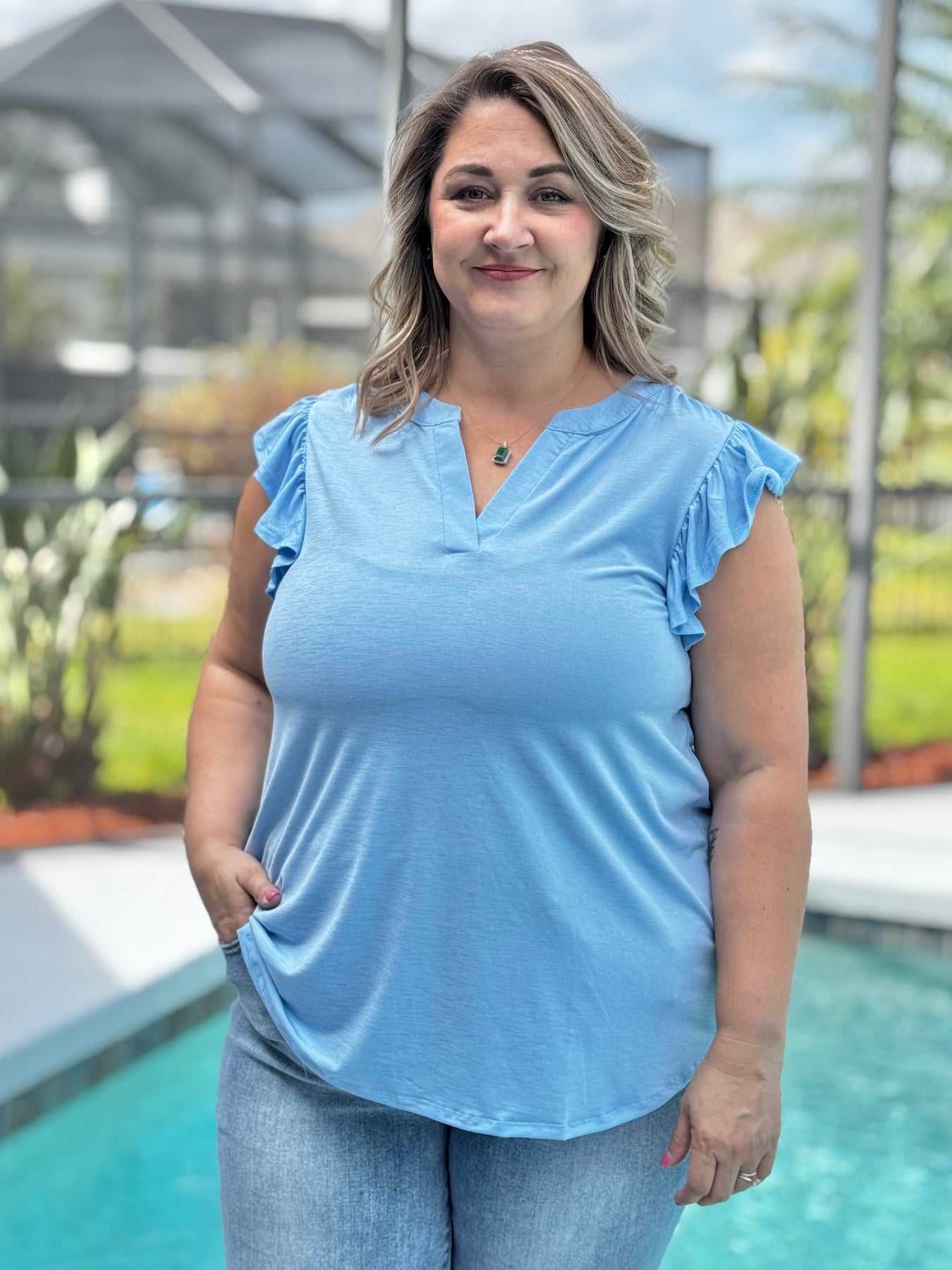 The Solid Lizzy Flutter Sleeve Top by Dear Scarlett - Blue
