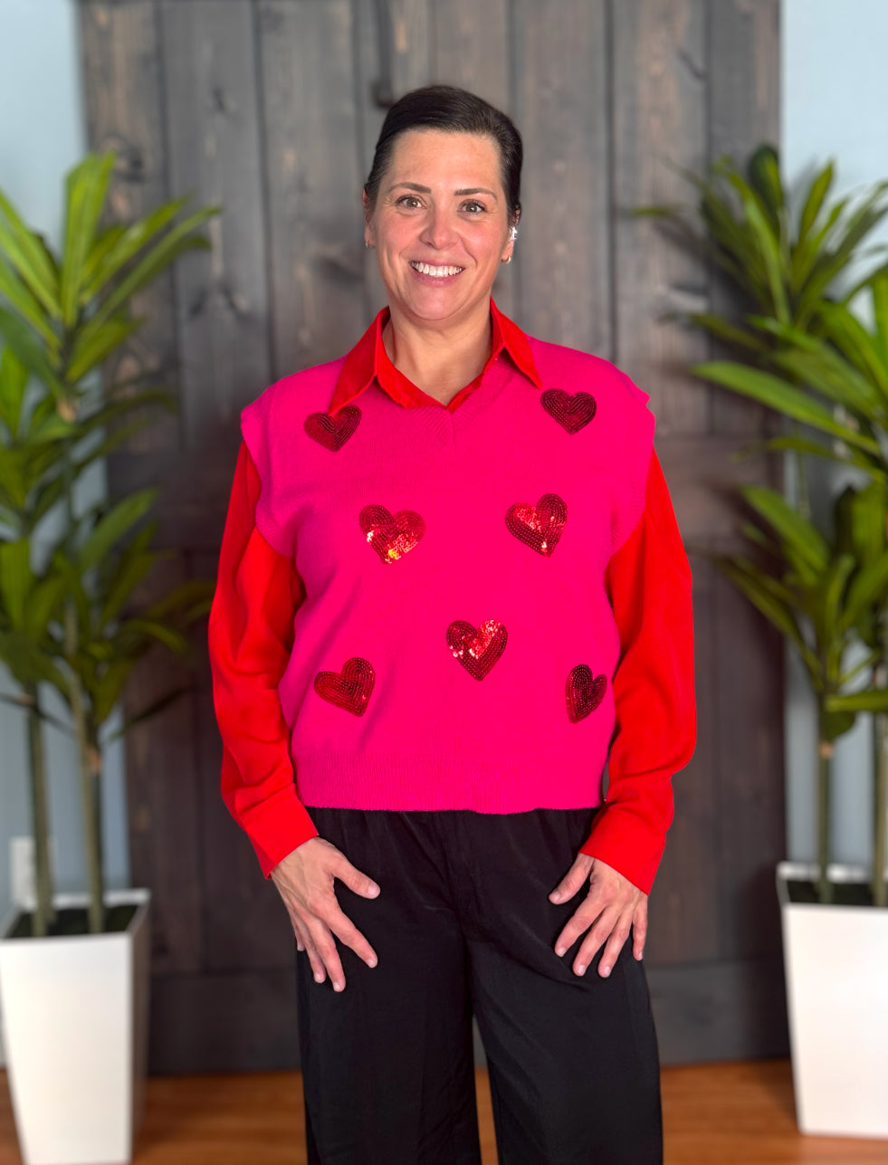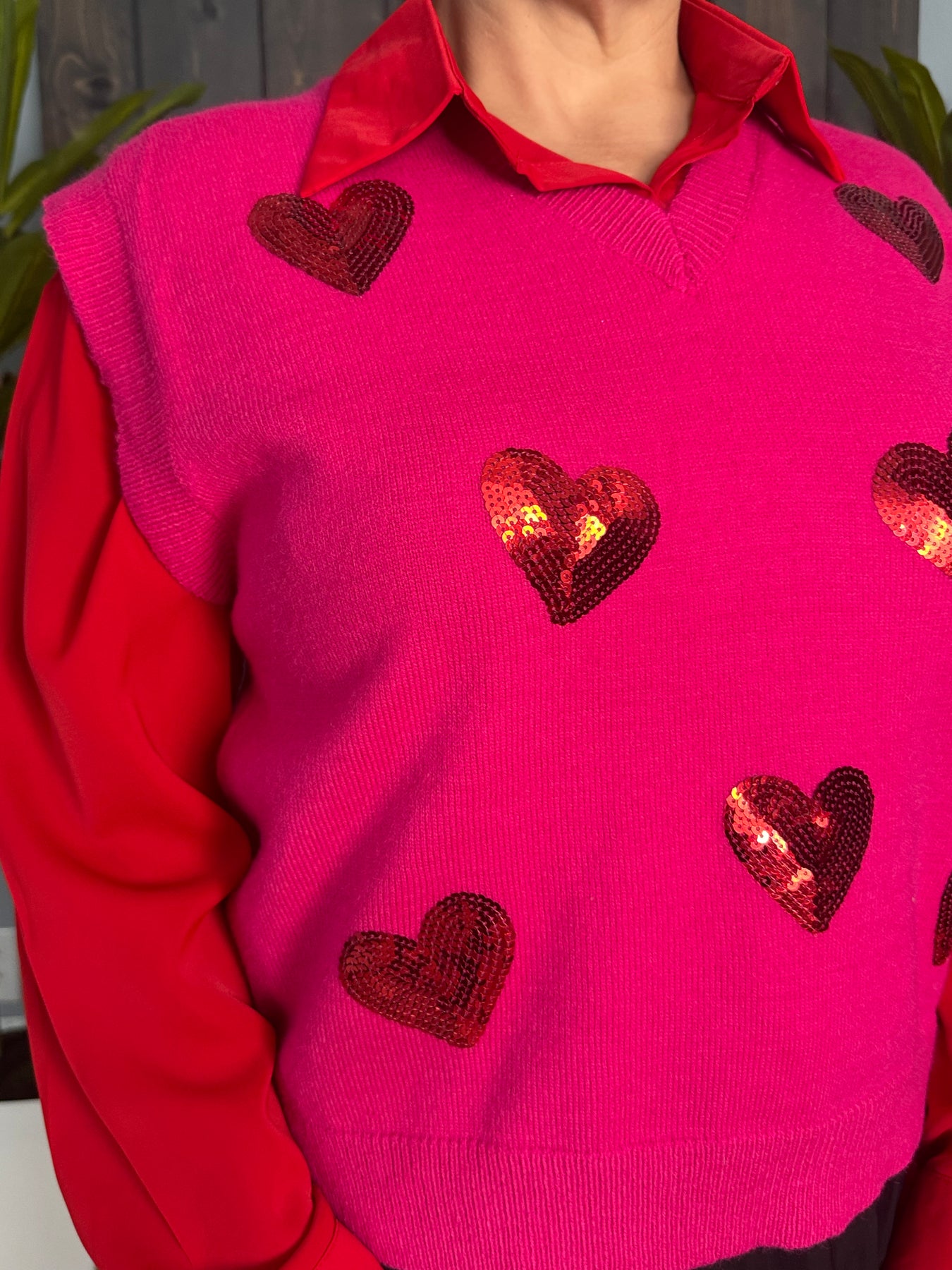 Fall in love with our Mi Amor Vest! This cute sweater vest features a soft knit material, a flattering v-cut neckline, and a beautiful sequin heart pattern. Perfect for Valentine's Day or any day, wear it alone or layer it over a long sleeve or button up for a versatile and stylish look. Spread love and style with this must-have addition to your wardrobe!