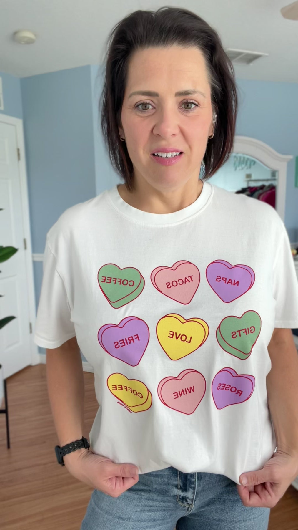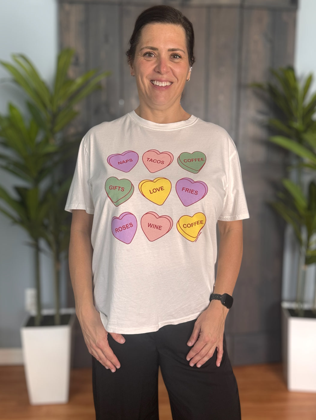 Get ready for Valentine's Day with our adorable My Favorite Things Graphic Tee! This short sleeve shirt features charming confection hearts and a playful design of all your favorite things. Spread the love with this cute and stylish tee that celebrates the joy of love and friendship.