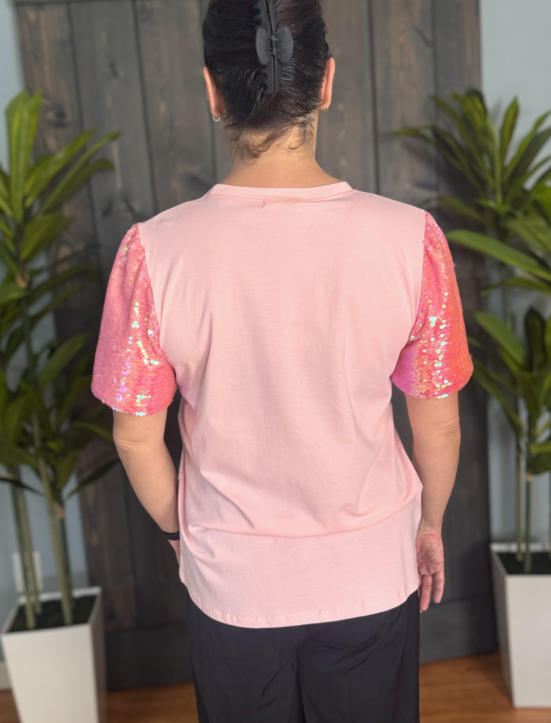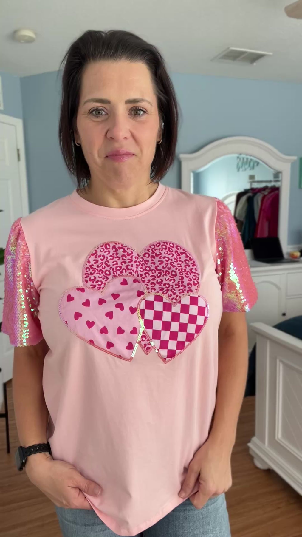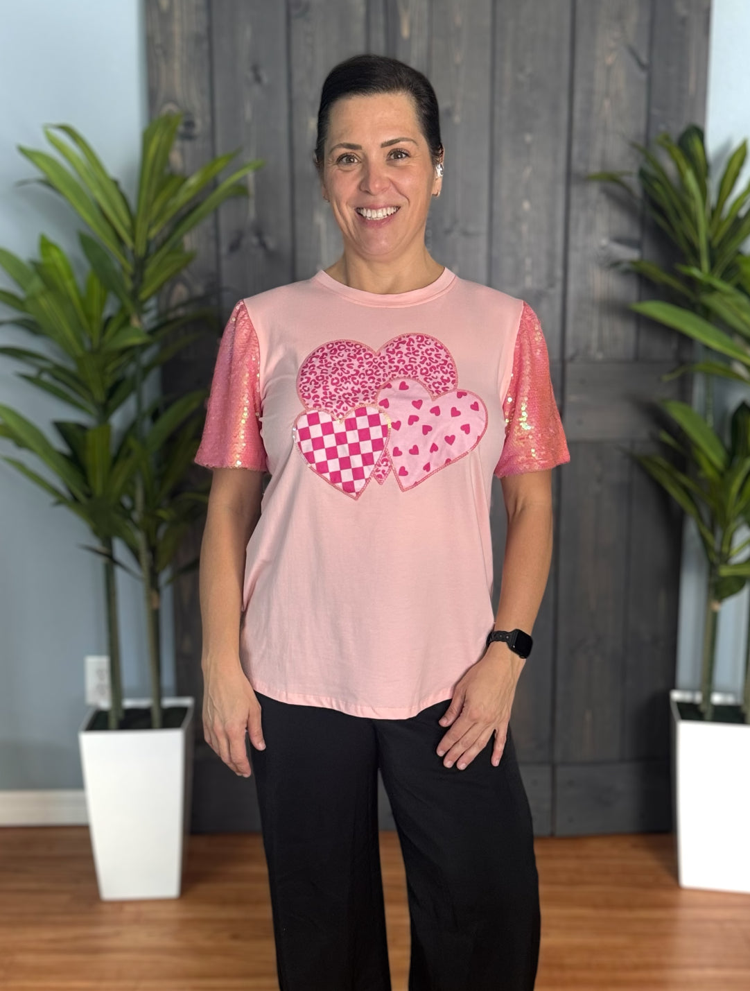 Get ready to shine and sparkle with our "You Make My Heart Sparkle" top! Featuring short sleeves and a multi-print heart design on the front, this top will surely make you stand out. The sequin sleeves add an extra touch of sparkle, making it perfect for any occasion. The pink color and multi print hearts will have you feeling confident and stylish. Order now and make everyone's heart skip a beat!