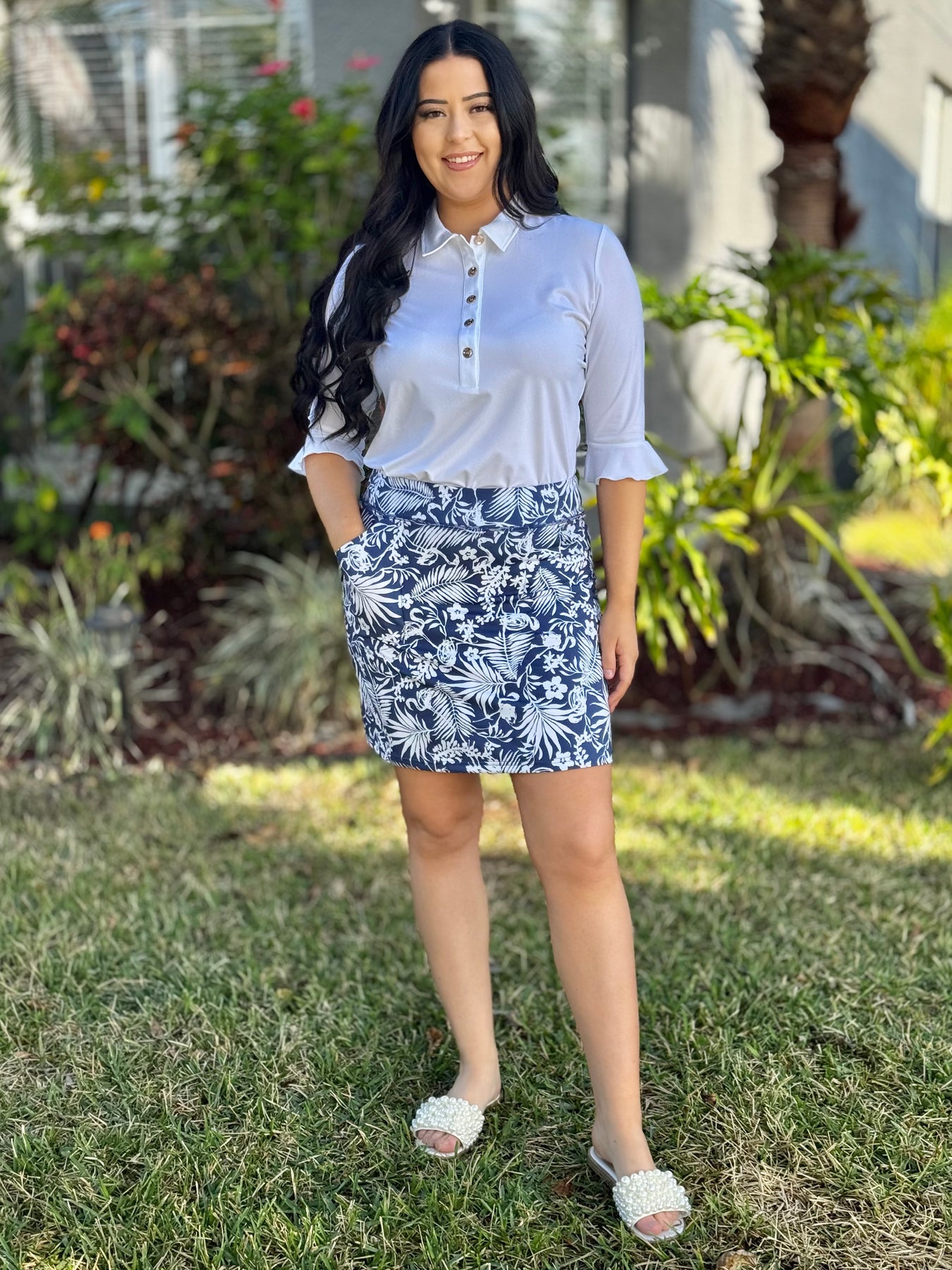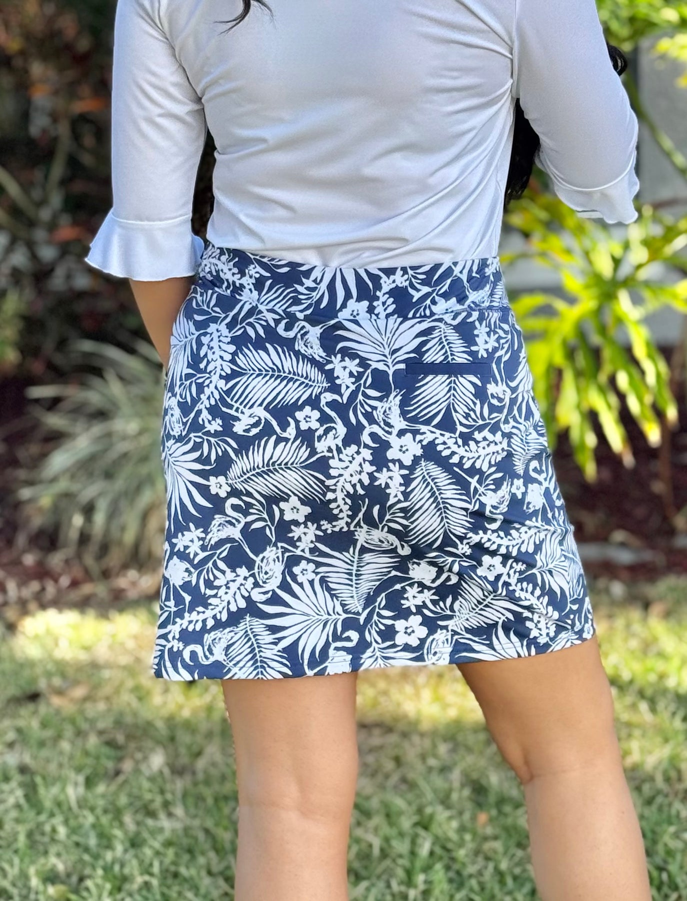 This edition features a navy and white tropical floral print with playful flamingos, creating a look that’s bold, breezy, and full of coastal charm. Whether you dress it up with a crisp blouse and sandals or keep it casual with a tank and sneakers, this skort transitions seamlessly from laid-back to polished.
