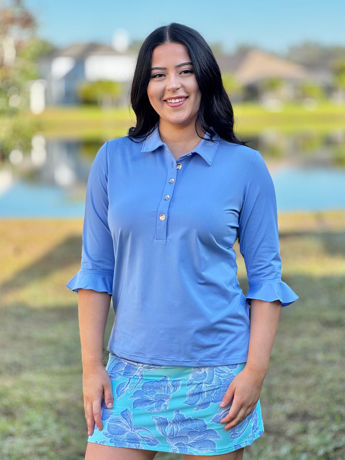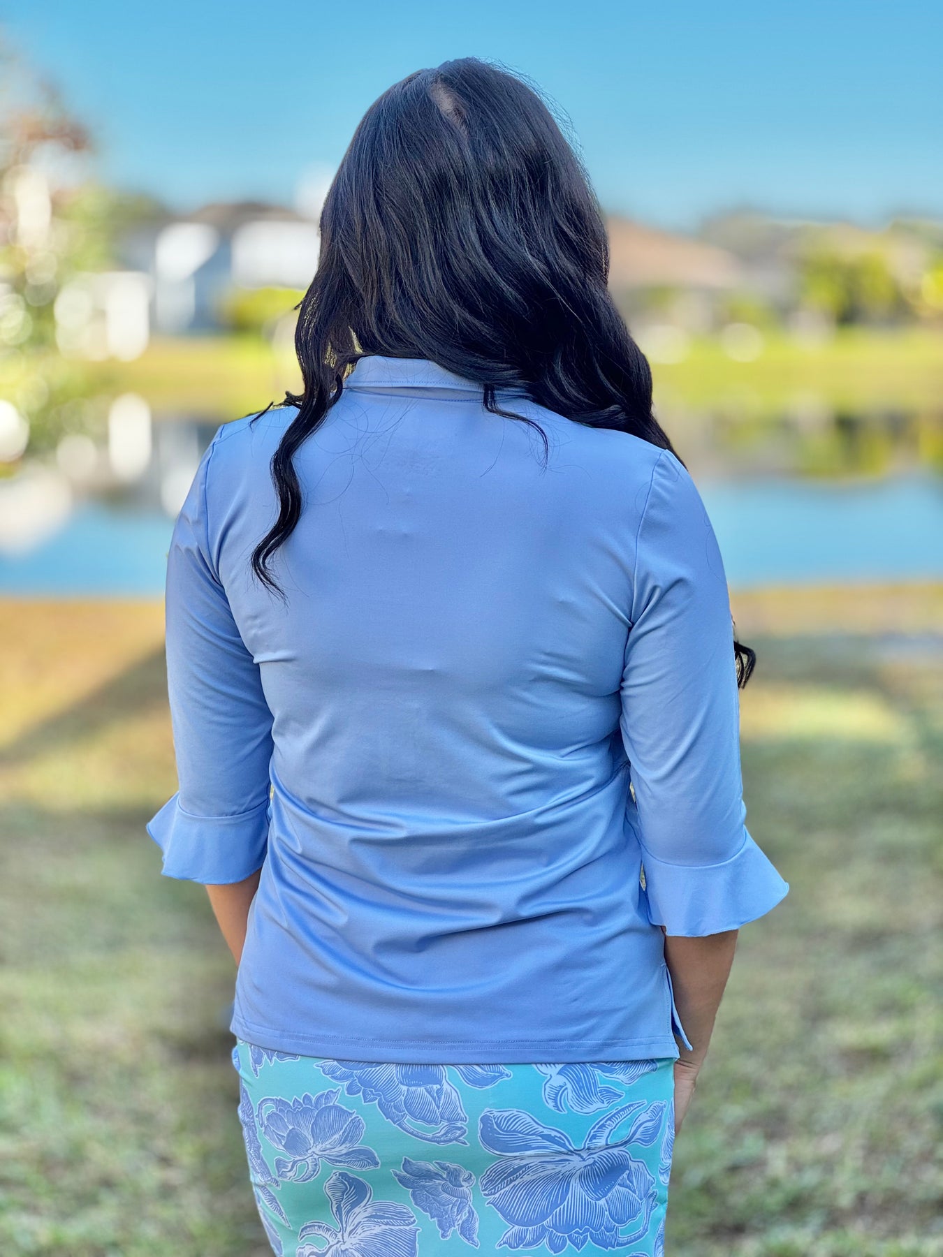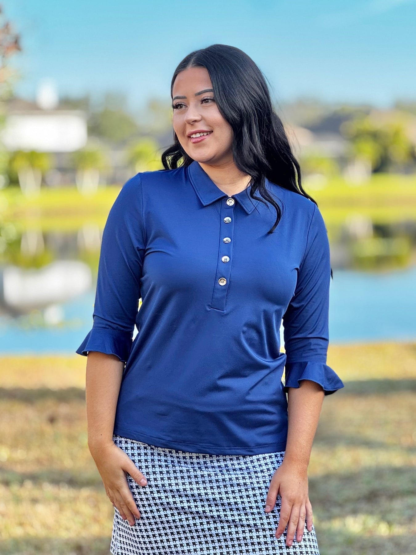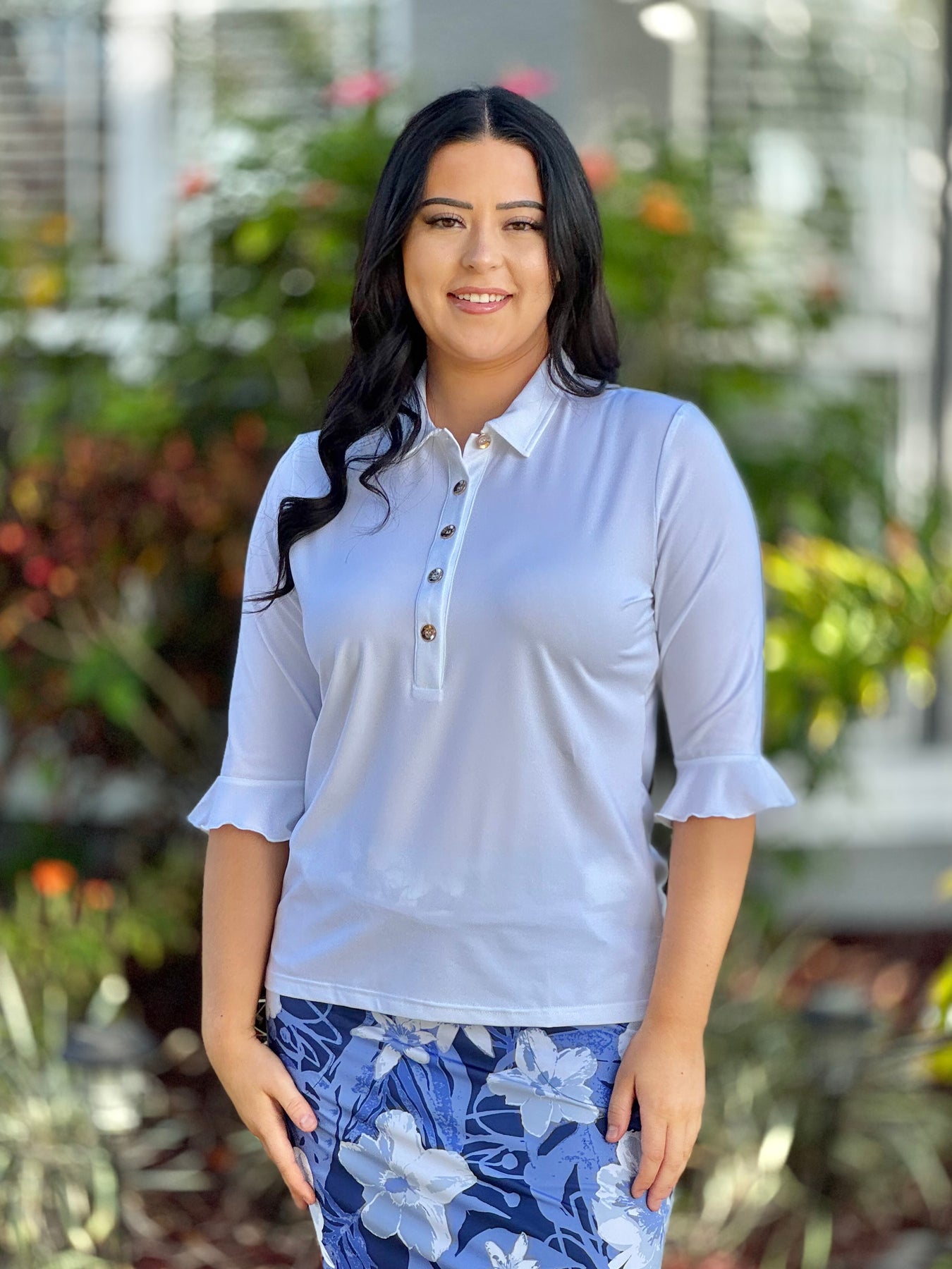 Designed with three-quarter sleeves finished in soft ruffle hem accents, this top brings a touch of feminine movement to every outfit. The collared neckline and V-cut front with functioning gold button details create a polished, boutique-level look that can be dressed up or down with ease.