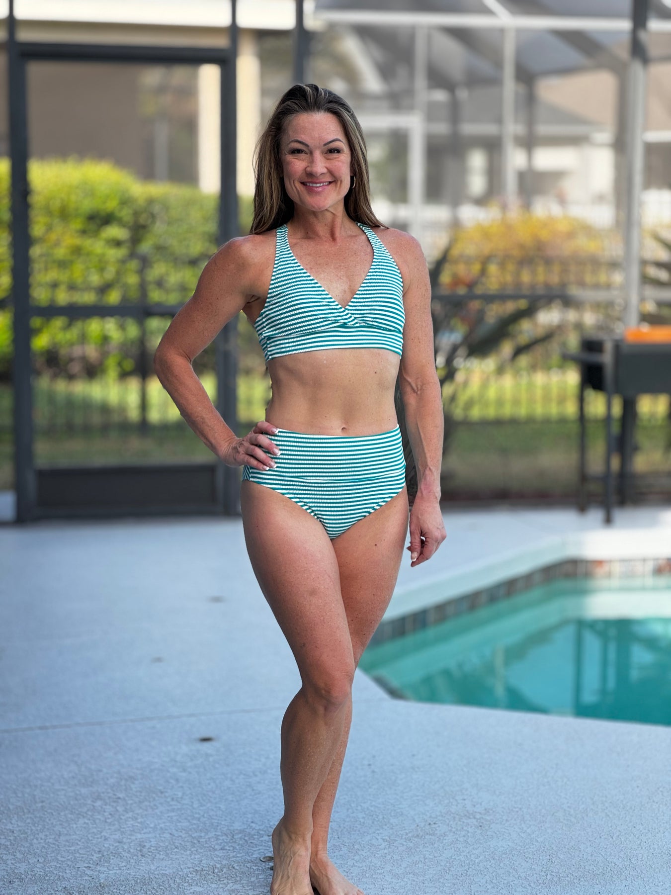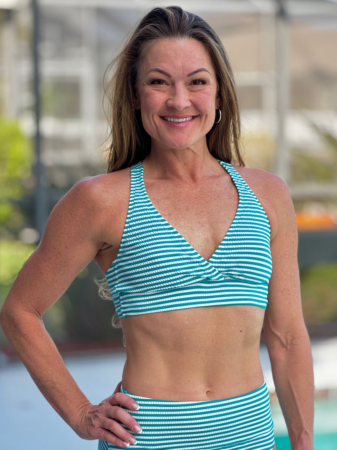 Thick, adjustable X-back straps provide enhanced support and stability while allowing you to customize the fit to your body. The clasp closure adds an extra layer of security, so you can focus on enjoying the moment. Available in both B/C and D cup options, this bikini top is designed to flatter and support a range of sizes. Finished in the vibrant Island Teal shade from the Coronado Stripe collection, it pairs perfectly with coordinating bottoms or your favorite high-waisted swimwear for a sporty, polished look that’s ready for every sunny adventure.