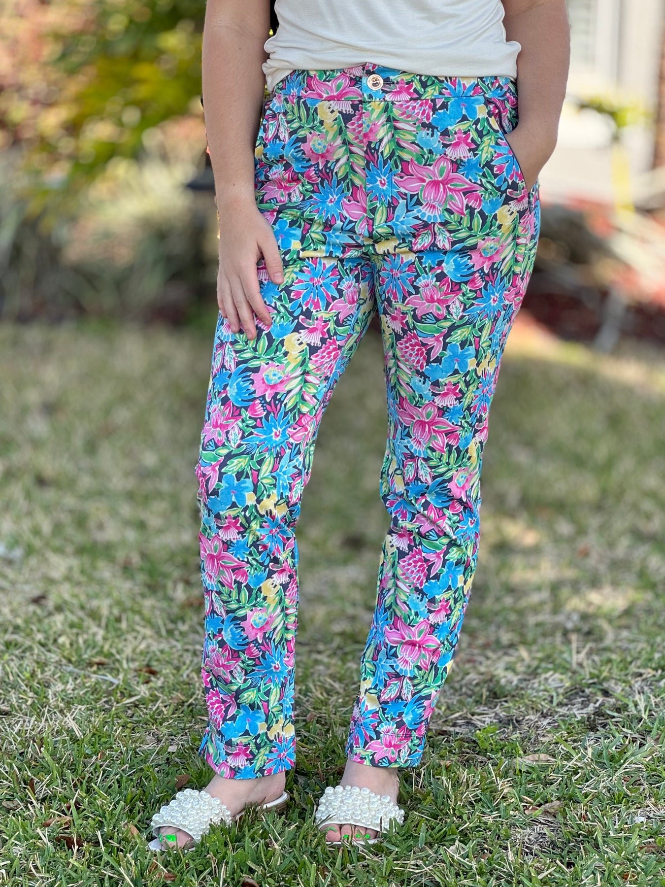 Featuring a zipper and button front with functional pockets, these pants combine everyday practicality with boutique-worthy details. The bold, fun print adds a playful statement that instantly elevates your look, making them a standout piece in your warm-weather wardrobe.